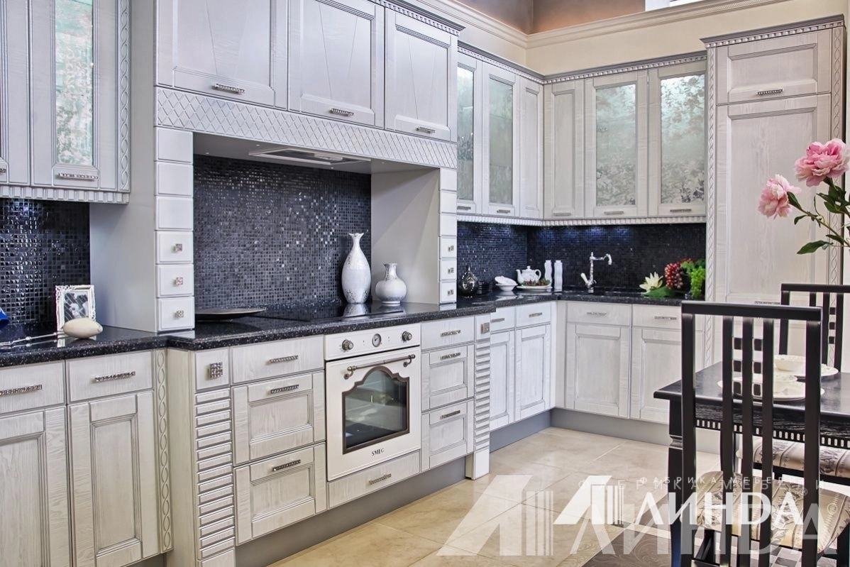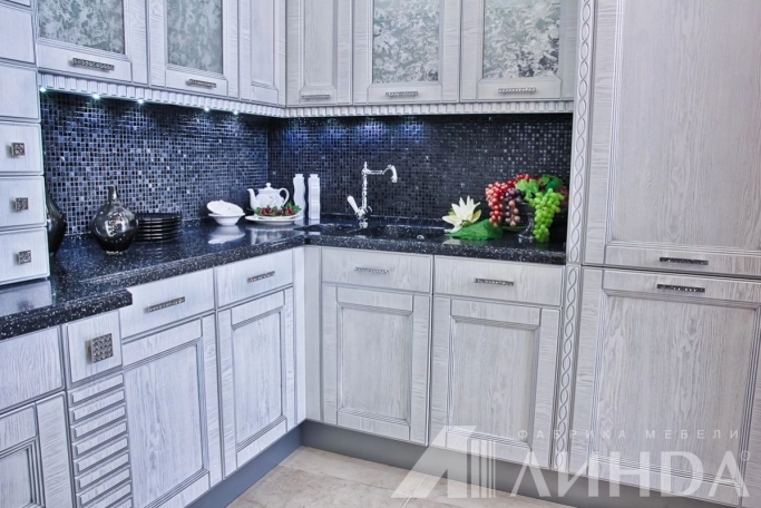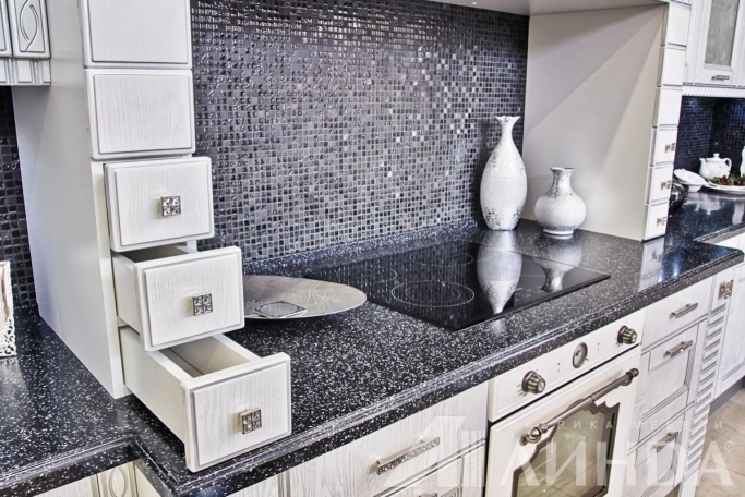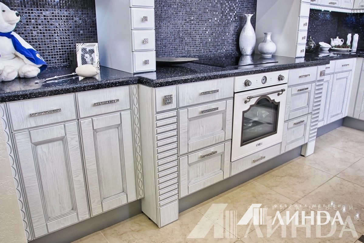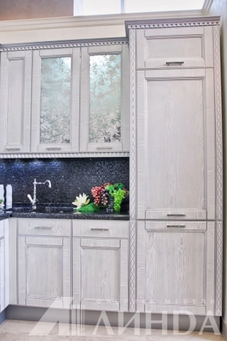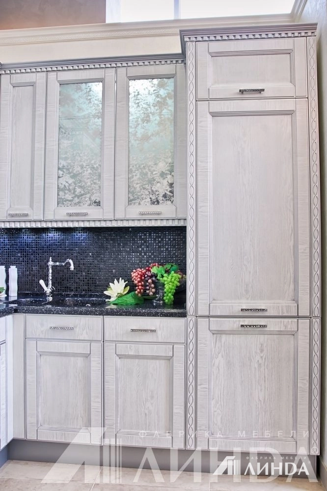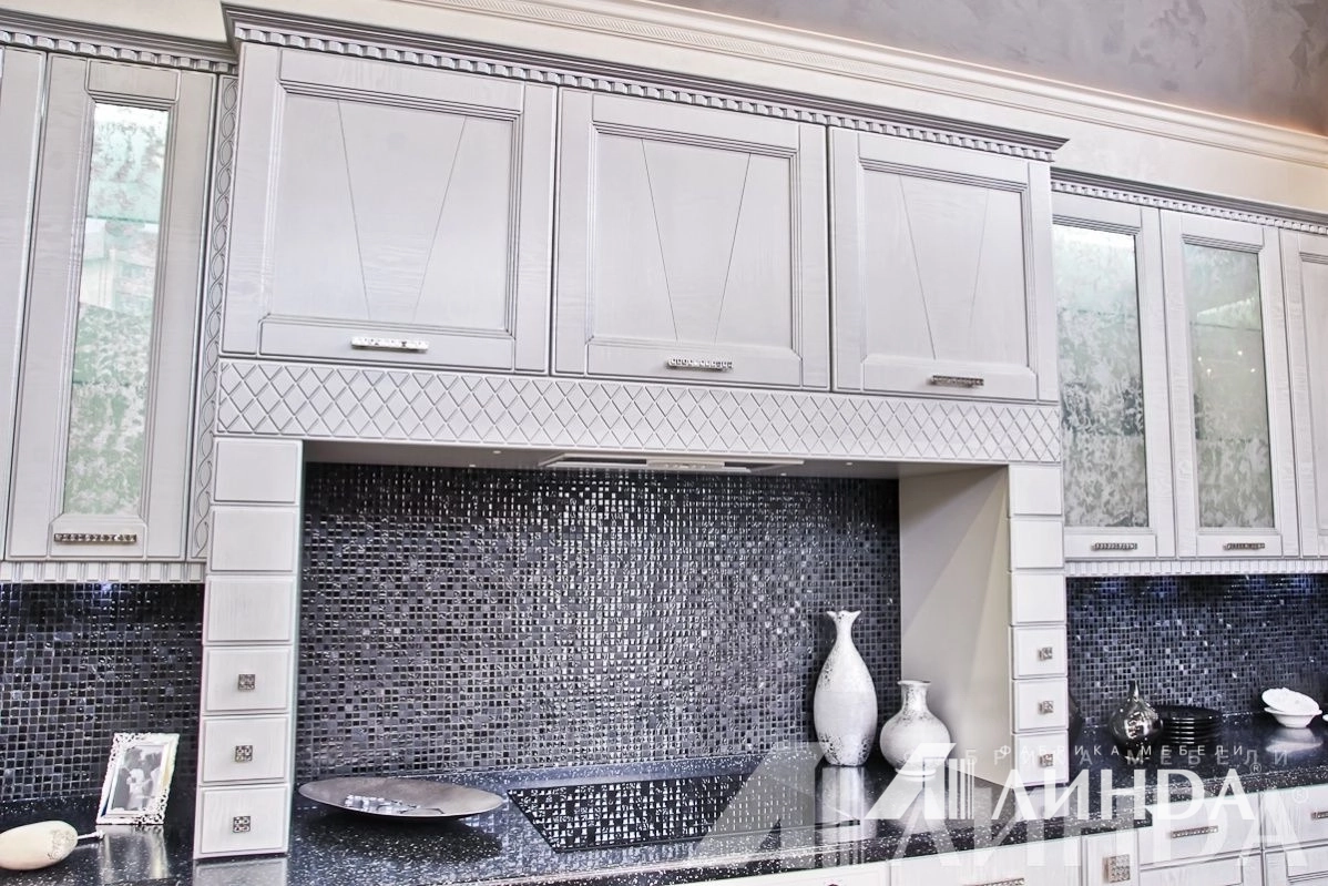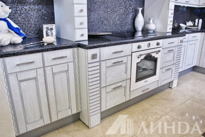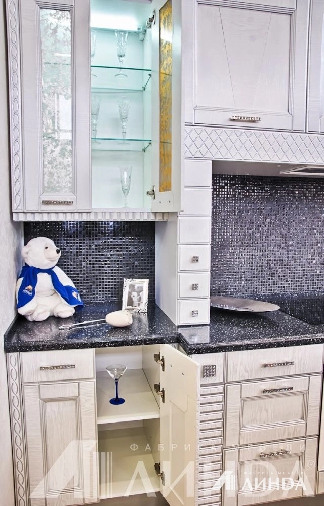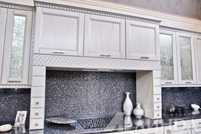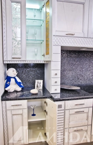 Классическая кухня "Анжу" воплощает в себе образ, навеянный великолепием французских речных долин, величием средневековых замков. Уникальные фасады изготовлены по сложной технологии в самых современных декорах. Белаятекстура дерева, оттененная серебряной патиной, великолепно сочетается с блестящими витринами из стекла Триплекс, создающего эффект патали. Все это великолепие подкреплено исключительной функциональностью, которую обеспечивает встроенная техника: на первый взгляд видны варочная поверхность и духовой шкаф, а за фасадами скрыты встроенная посудомоечная машина и холодильник в пенале. Для наибольшего удобства в зоне готовки, выкатные ящики оснащены системами полного выдвижения Blum Tandembox, а также по обе стороны от варочной поверхности встроены выкатные бутылочницы Vauth-Sagel, чтобы масла и приправы всегда были под рукой. Отдельного упоминания достойна шикарная черная столешница из искусственного камня, вкупе с мозаичным фартуком составляющая контраст светлым фасадам.