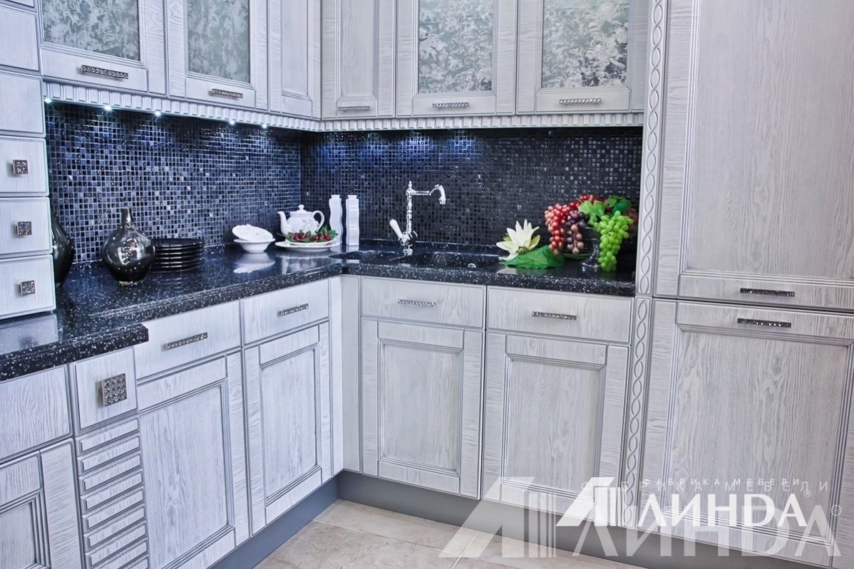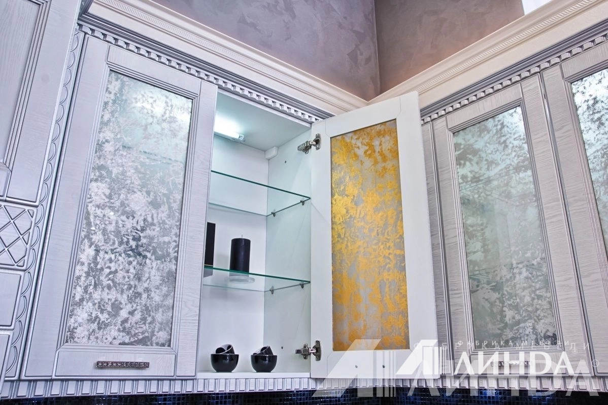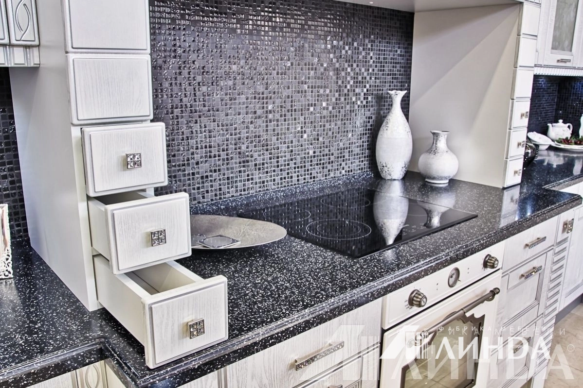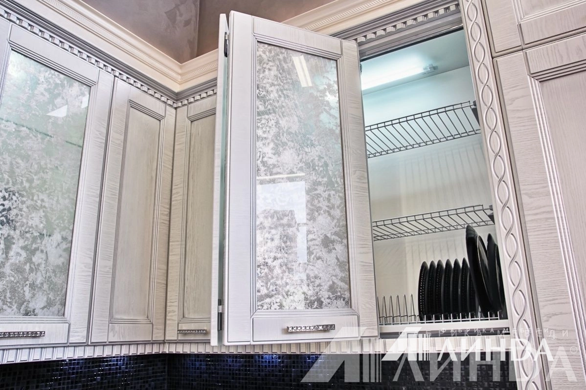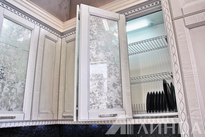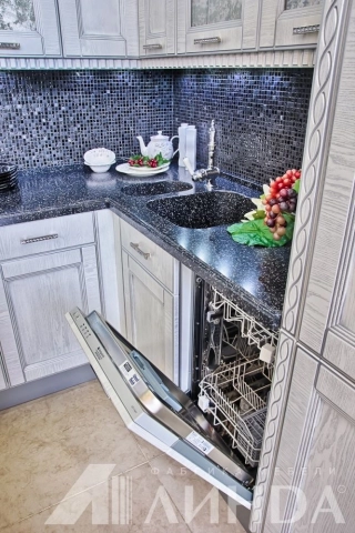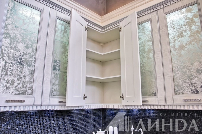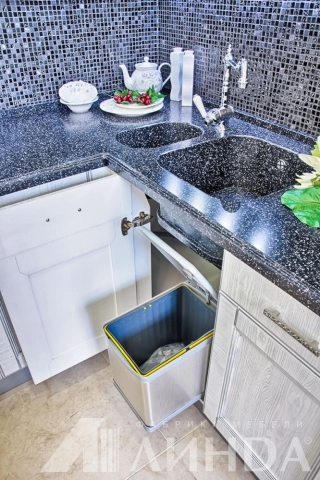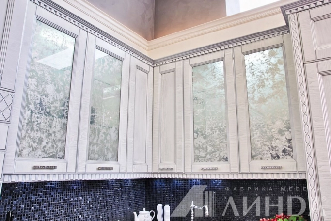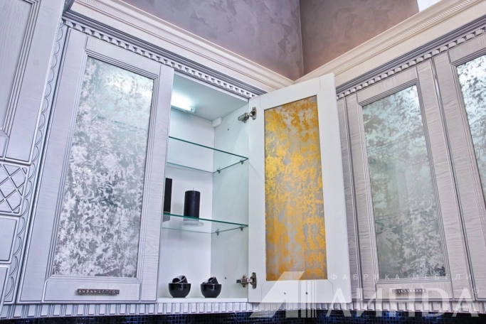 Классическая кухня "Анжу" воплощает в себе образ, навеянный великолепием французских речных долин, величием средневековых замков. Уникальные фасады изготовлены по сложной технологии в самых современных декорах. Белаятекстура дерева, оттененная серебряной патиной, великолепно сочетается с блестящими витринами из стекла Триплекс, создающего эффект патали. Все это великолепие подкреплено исключительной функциональностью, которую обеспечивает встроенная техника: на первый взгляд видны варочная поверхность и духовой шкаф, а за фасадами скрыты встроенная посудомоечная машина и холодильник в пенале. Для наибольшего удобства в зоне готовки, выкатные ящики оснащены системами полного выдвижения Blum Tandembox, а также по обе стороны от варочной поверхности встроены выкатные бутылочницы Vauth-Sagel, чтобы масла и приправы всегда были под рукой. Отдельного упоминания достойна шикарная черная столешница из искусственного камня, вкупе с мозаичным фартуком составляющая контраст светлым фасадам.