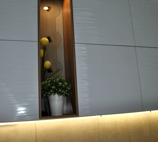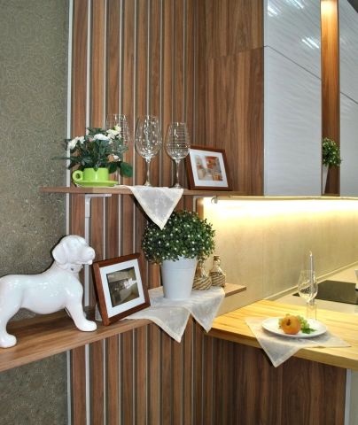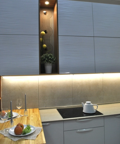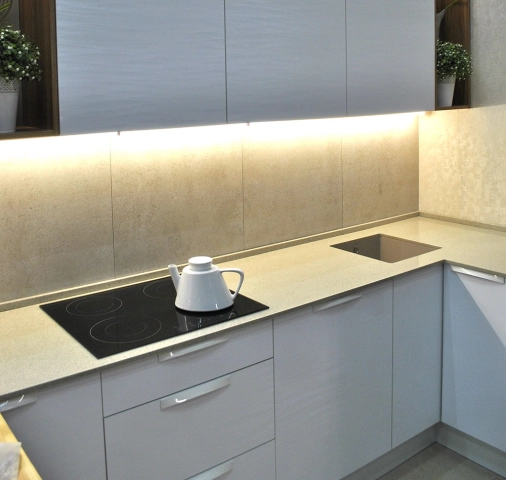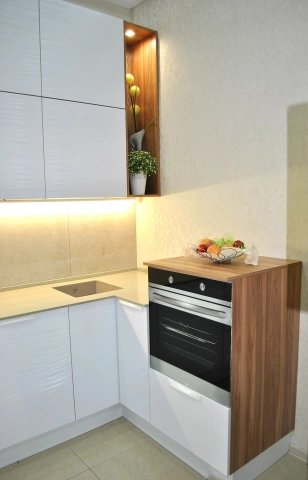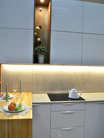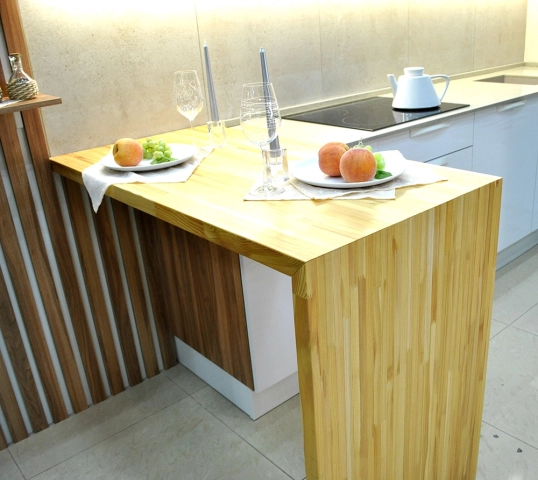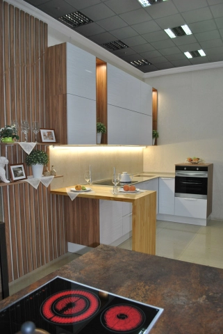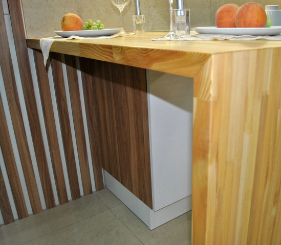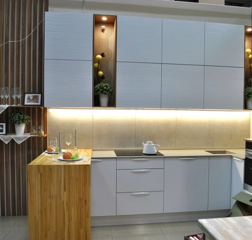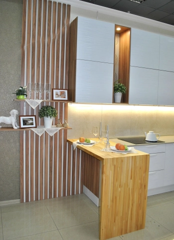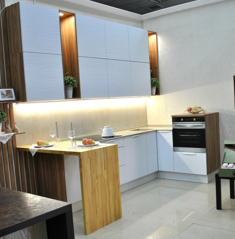 Фасады AGT "Белая пустыня"; корпус Орех Мармара, столешница искусственный гранит 14 мм; барная стойка из массива лиственницы. Фурнитура Блюм, Хеттиг.