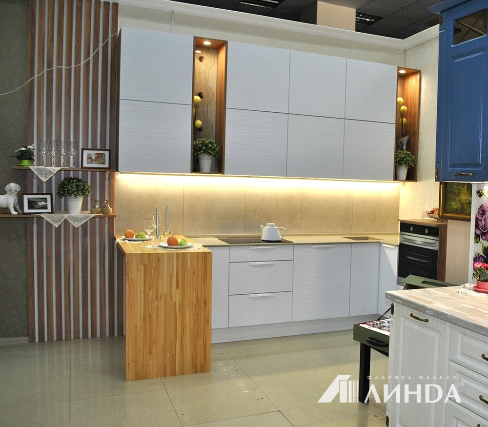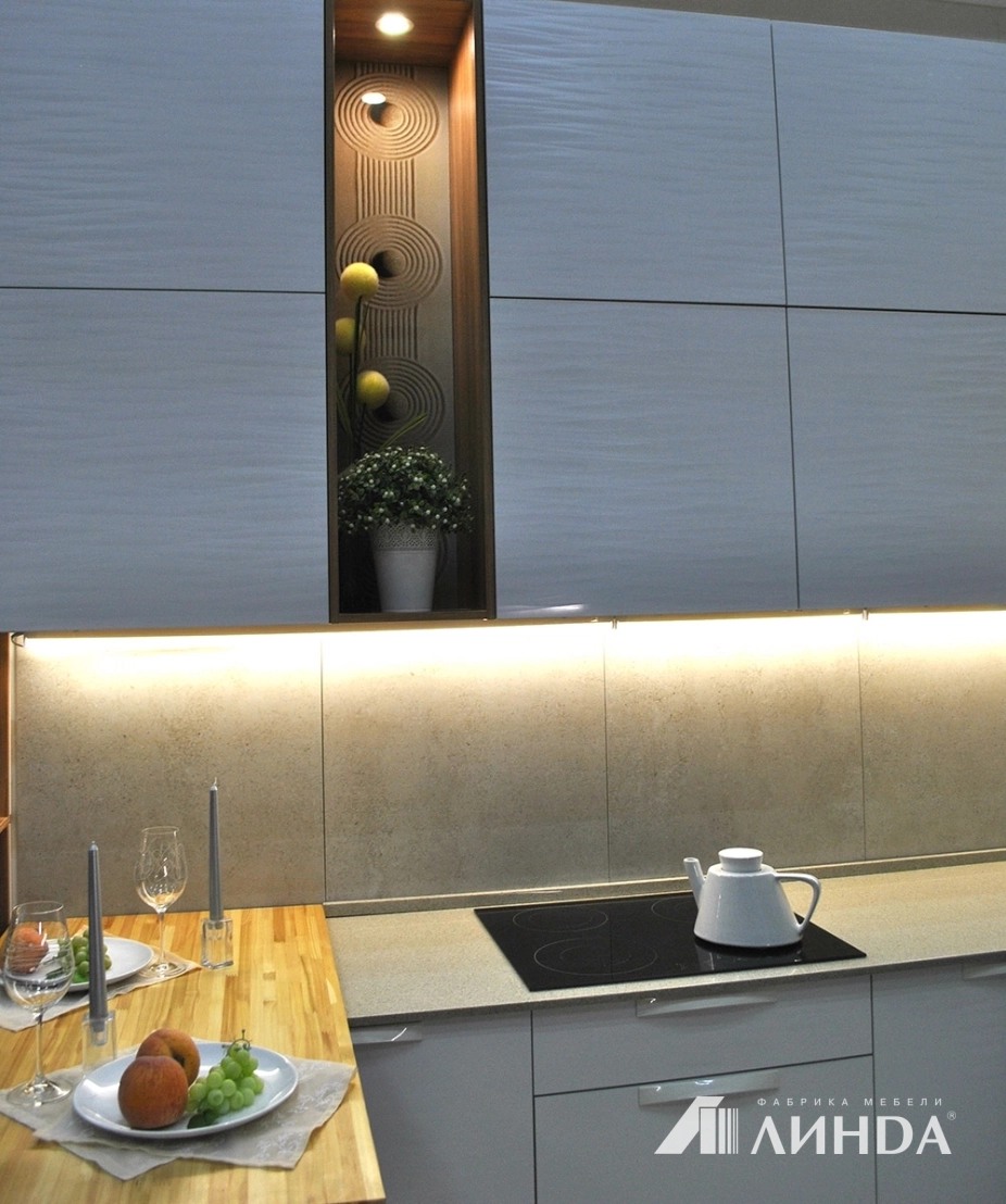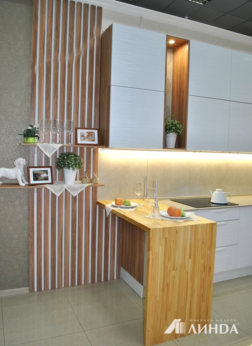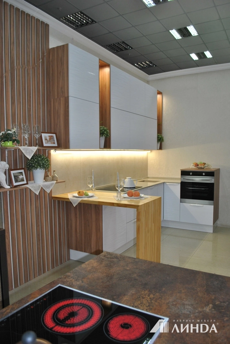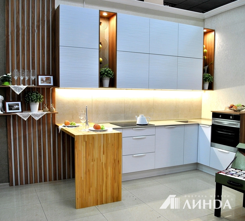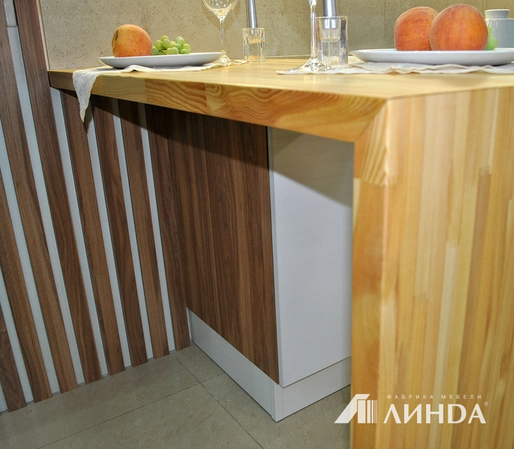 Фасады AGT "Белая пустыня"; корпус Орех Мармара, столешница искусственный гранит 14 мм; барная стойка из массива лиственницы. Фурнитура Блюм, Хеттиг.