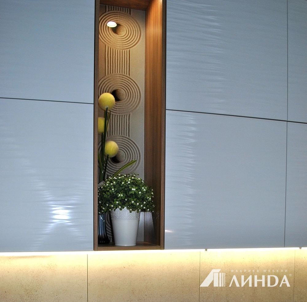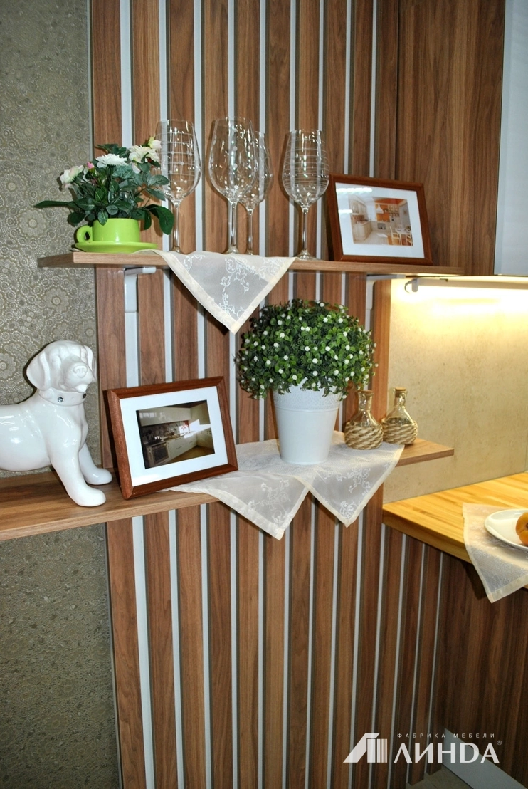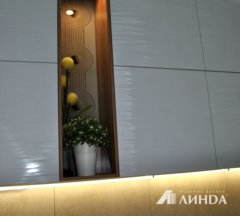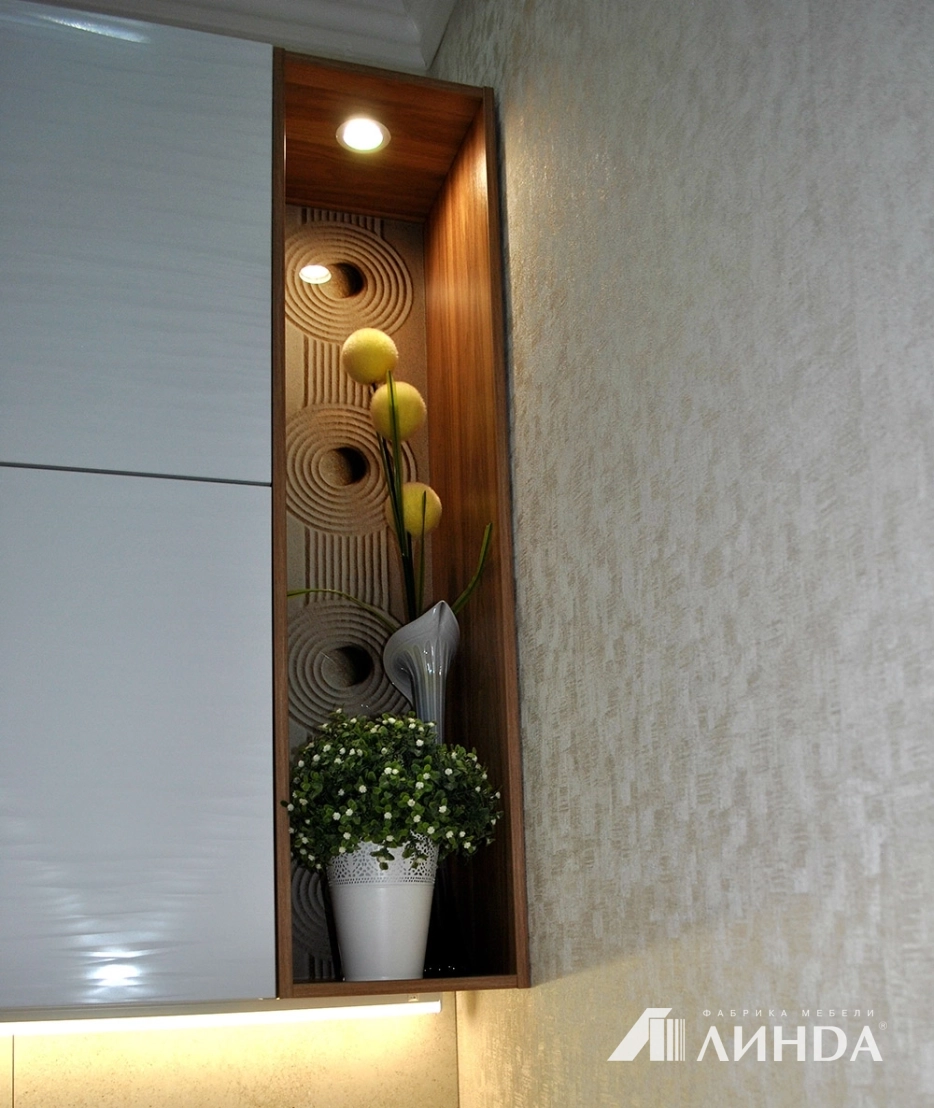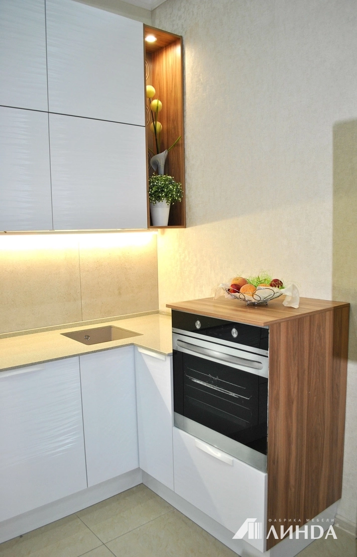 Фасады AGT "Белая пустыня"; корпус Орех Мармара, столешница искусственный гранит 14 мм; барная стойка из массива лиственницы. Фурнитура Блюм, Хеттиг.