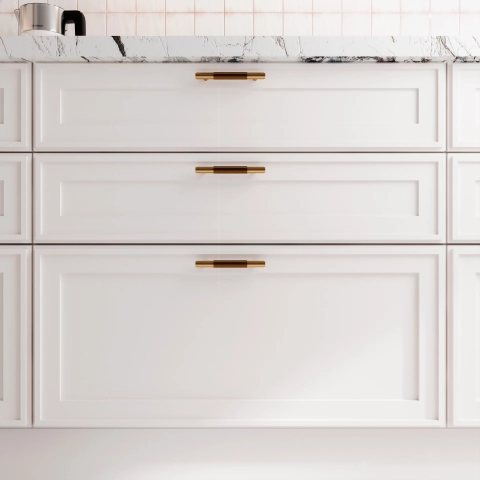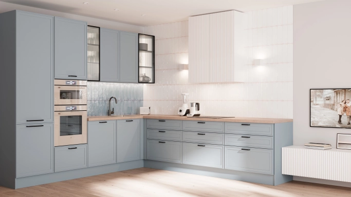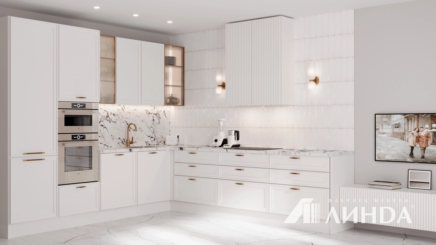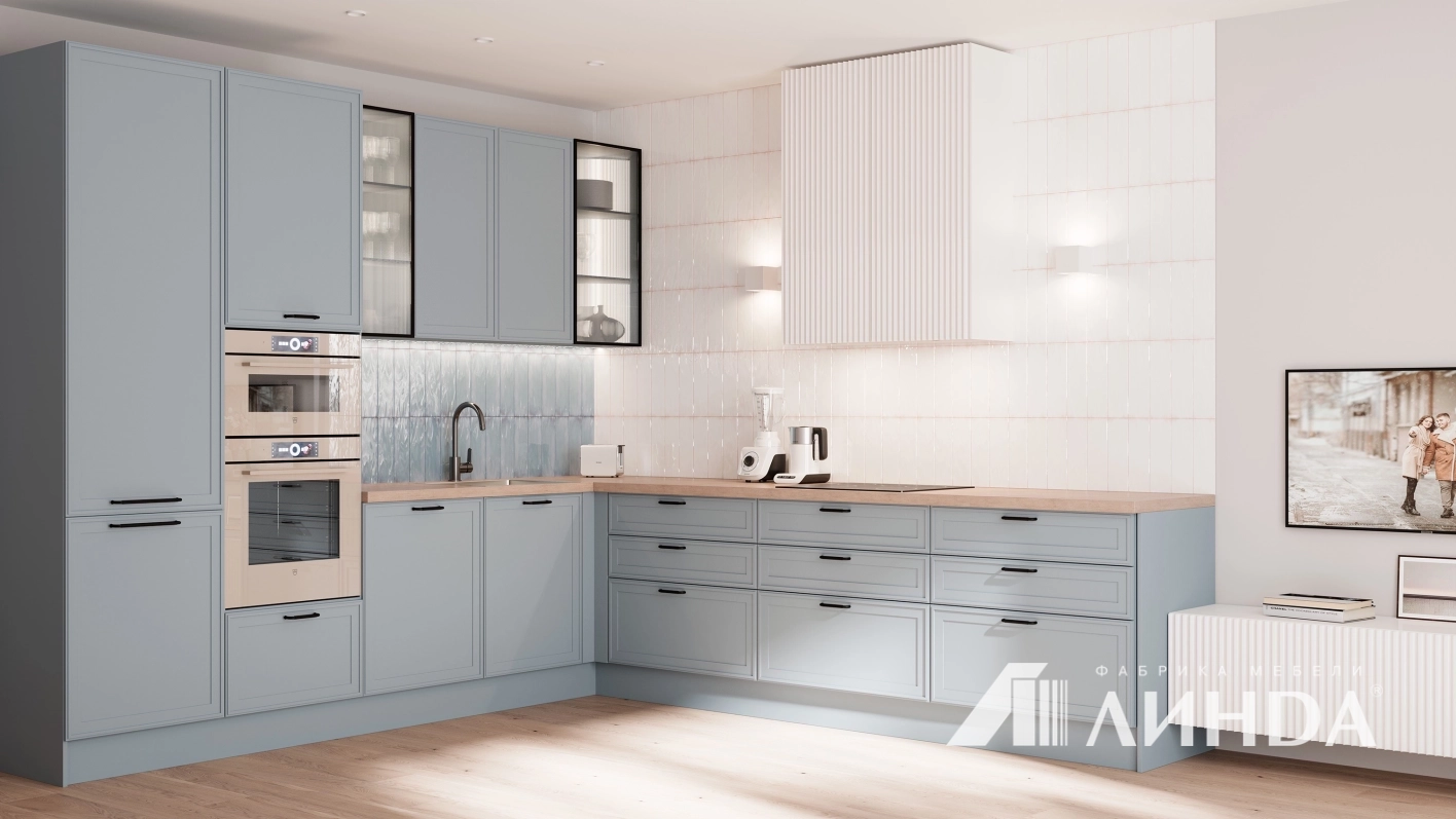 Воздушная кухня Иннри внесет свежесть в интерьер вашего дома. Строгость форм здесь идет за руку с изящными элементами модного золотистого цвета, мягкими, пастельными оттенками фасада, качественными текстурами столешниц, имитирующих натуральный камень или дерево. Рельефные стекла, придают глубины и загадочности. Навесной модуль для полновстраиваемой вытяжки представляет собой арт-объект и несет не только функциональную, но и эстетическую нагрузку.