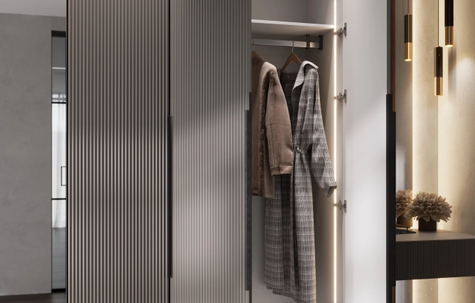 Эффектное и в тоже время очень практичное решение: компактная кухня, плавно перетекающая в шкаф и прихожую. Эргономичное зонирование помогло сохранить максимум свободного места. В квартире задействован каждый сантиметр пространства.