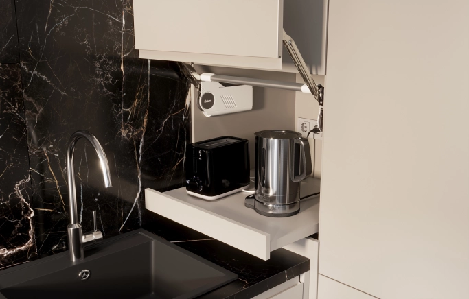 Функциональное решение для углового модуля - выкатная полка для мелкой бытовой техники - скрыта за фасадом с подъемным механизмом. Отличная идея для тех, кто любит легко поддерживать идеальный порядок на кухне. Да, именно такой и должна быть кухня в быстро меняющемся мире возможностей и перспектив.