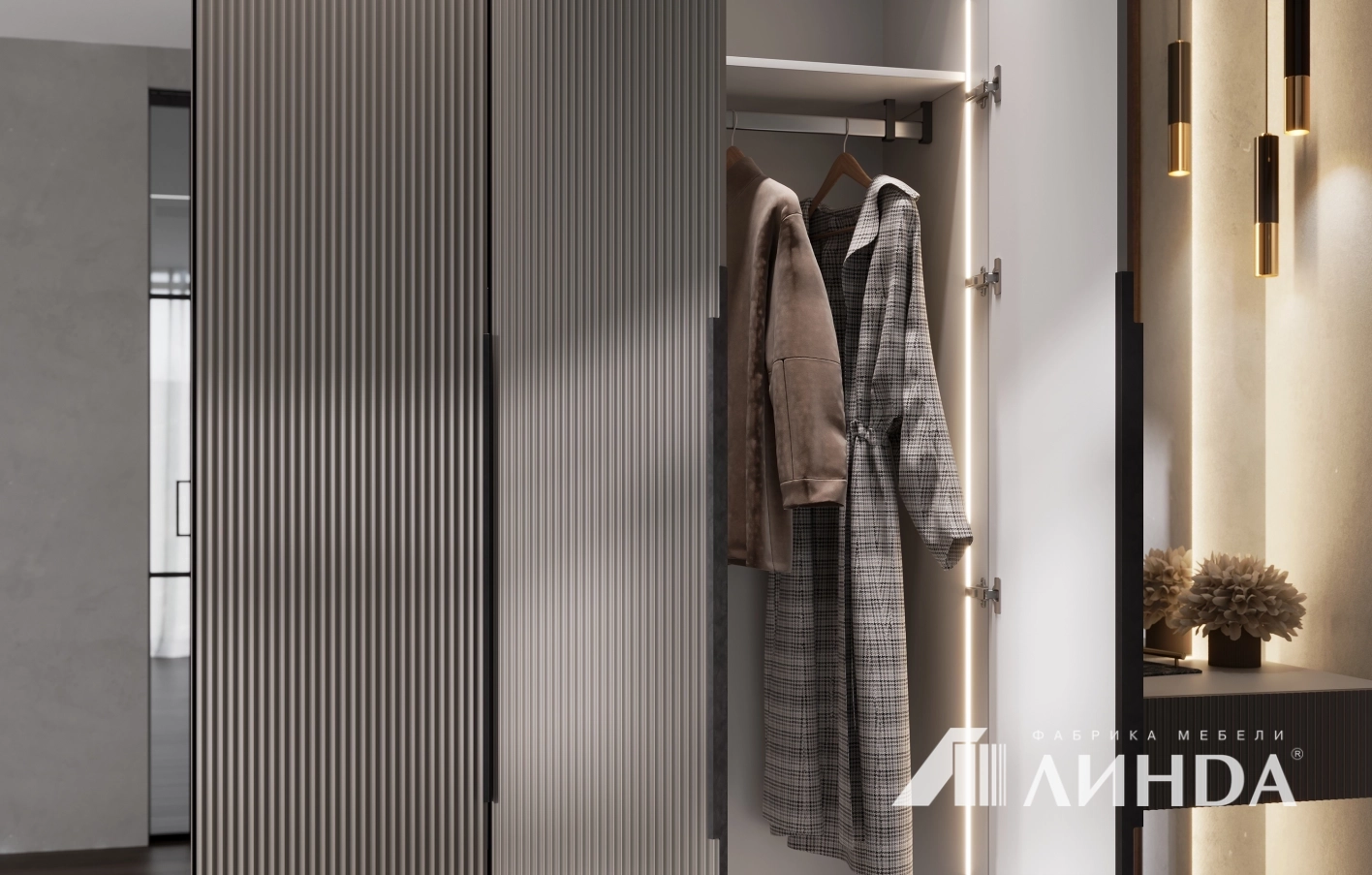 Эффектное и в тоже время очень практичное решение: компактная кухня, плавно перетекающая в шкаф и прихожую. Эргономичное зонирование помогло сохранить максимум свободного места. В квартире задействован каждый сантиметр пространства.