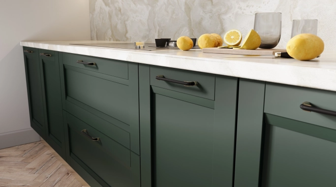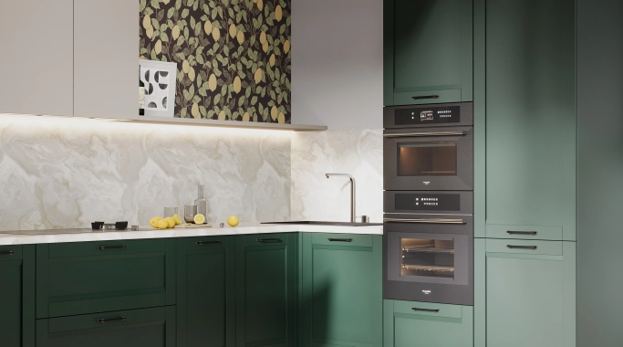 Марна восхищает своей утончённостью и продуманными деталями. Главный акцент здесь сделан на фасады с изящной фрезеровкой, которые придают интерьеру благородства и художественного изыска. Основную цветовую гамму составляет сочный зелёный оттенок, оживляющий пространство и наполняющий его динамикой. Светлые каменные разводы на стеновых панелях и столешнице создают атмосферу изысканности и визуально расширяют пространство.