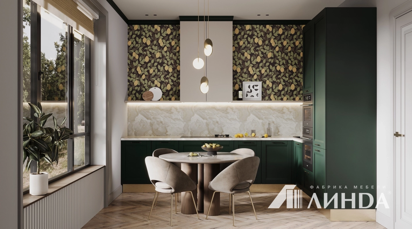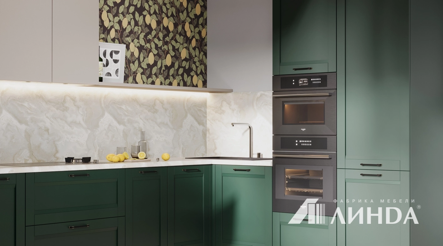 Марна восхищает своей утончённостью и продуманными деталями. Главный акцент здесь сделан на фасады с изящной фрезеровкой, которые придают интерьеру благородства и художественного изыска. Основную цветовую гамму составляет сочный зелёный оттенок, оживляющий пространство и наполняющий его динамикой. Светлые каменные разводы на стеновых панелях и столешнице создают атмосферу изысканности и визуально расширяют пространство.