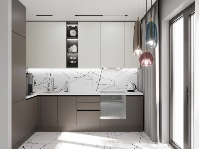 Обаятельная кухня Порту станет идеальным выбором для тех, кто ценит уют и умиротворение. Нейтральные серые оттенки гармонично сочетаются с мраморным декором, который, как символ неизменной красоты и долговечности, придает интерьеру особый шарм. Каждая деталь кухни тщательно продумана, чтобы обеспечить не только эстетическое наслаждение, но и функциональность на высшем уровне.