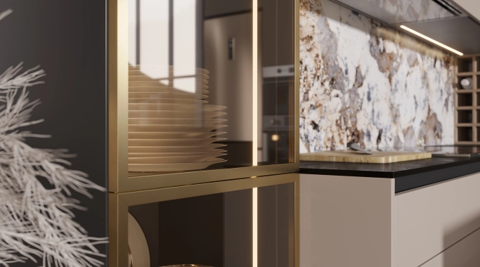 Сочетание бежевого, золотого, белого и серого не только эстетично, но и функционально. Такая цветовая палитра создает ощущение простора, света и уюта, делая кухню идеальным местом для сбора семьи и друзей.