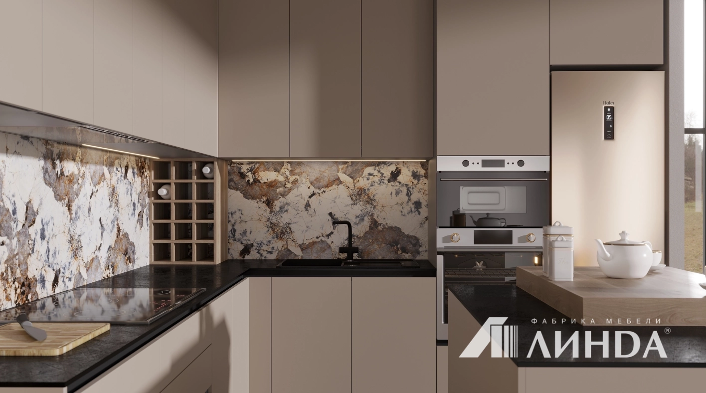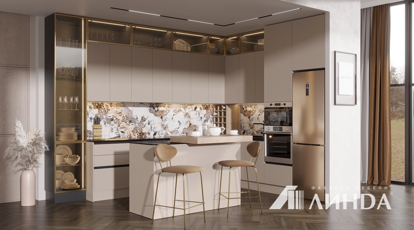 Сочетание бежевого, золотого, белого и серого не только эстетично, но и функционально. Такая цветовая палитра создает ощущение простора, света и уюта, делая кухню идеальным местом для сбора семьи и друзей.