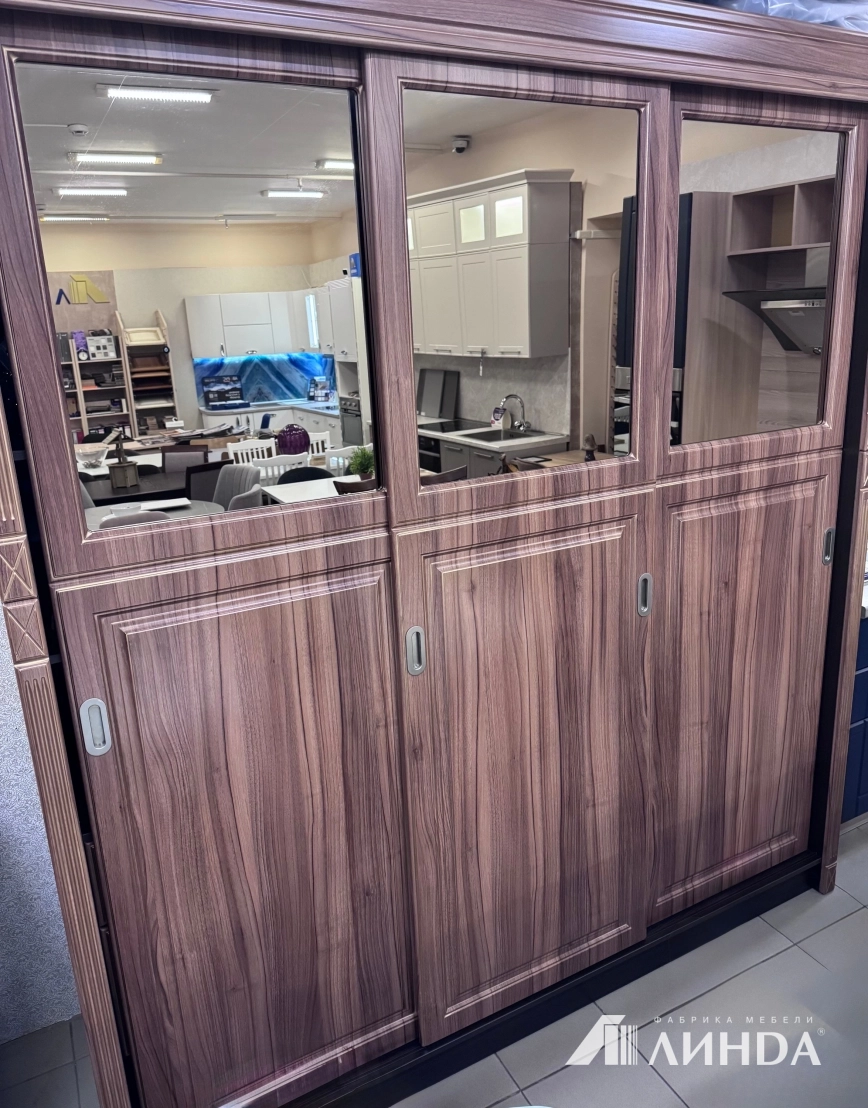 Фасады МДФ с фрезеровкой, «Орех натуральный» с патиной золото, зеркало бронза, корпус ЛДСП Венге.
