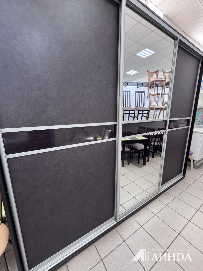 Шкаф купе длина 3000 мм, высота 2480 мм, глубина 700мм. Материал фасада МДФ, облицованный ПВХ под кожу, вставка ПВХ венге глянец. Средний фасад Зеркало серебро.