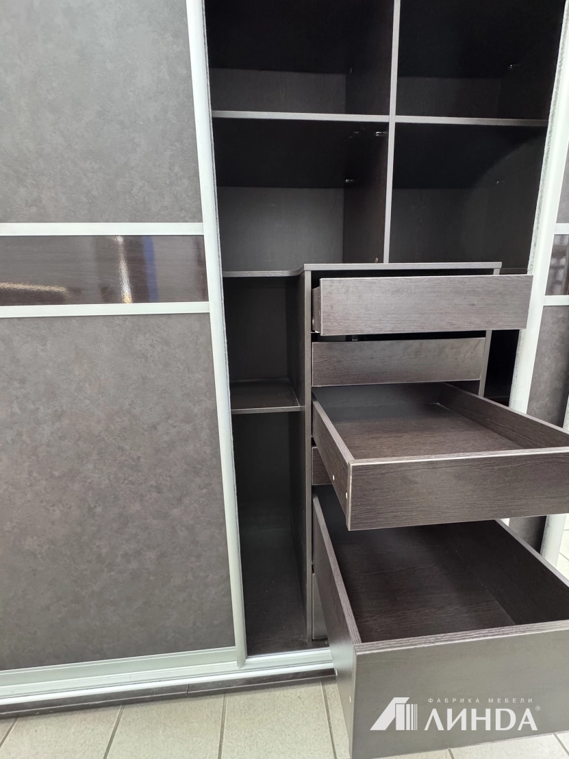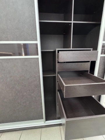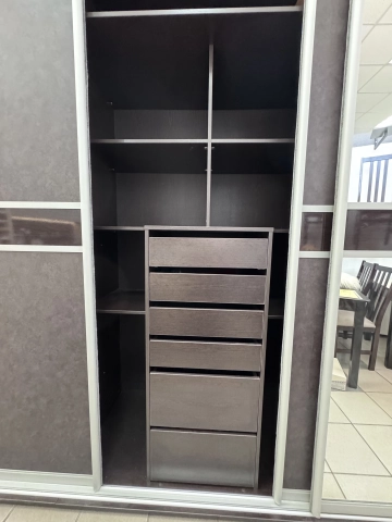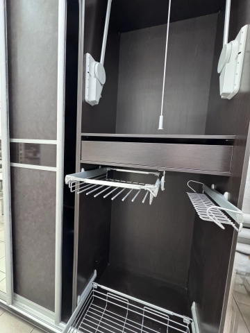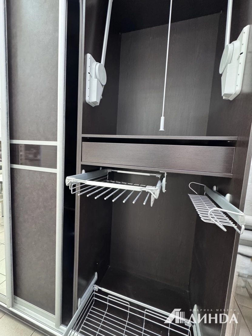 Направляющие дверей система Aristo, цвет серебро. Корпус ЛДСП Венге. Наполнение шкафа, корзины и т.д.Vibo Италия, пантограф Италия, ящики с доводчиками, направляющие Hettich.